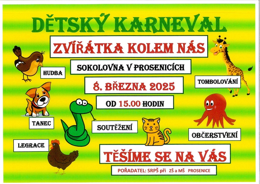 Přijměte pozvání do tělocvičny ZŠ a MŠ Prosenice na DĚTSKÝ KARNEVAL, který se koná v sobotu 8. března 2025 od 15 hodin. Téma karnevalu jsou zvířátka kolem nás. Občerstvení bude zajištěno.