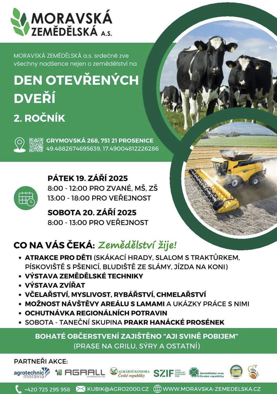 Moravská zemědělská a.s. zve na dny otevřených dveří v pátek 19. září a v sobotu 20. září 2025. Těšit se můžete na atrakce pro děti, výstavu zemědělské techniky, zvířat, ochutnávku regionálních potravin a mnoho dalšího.