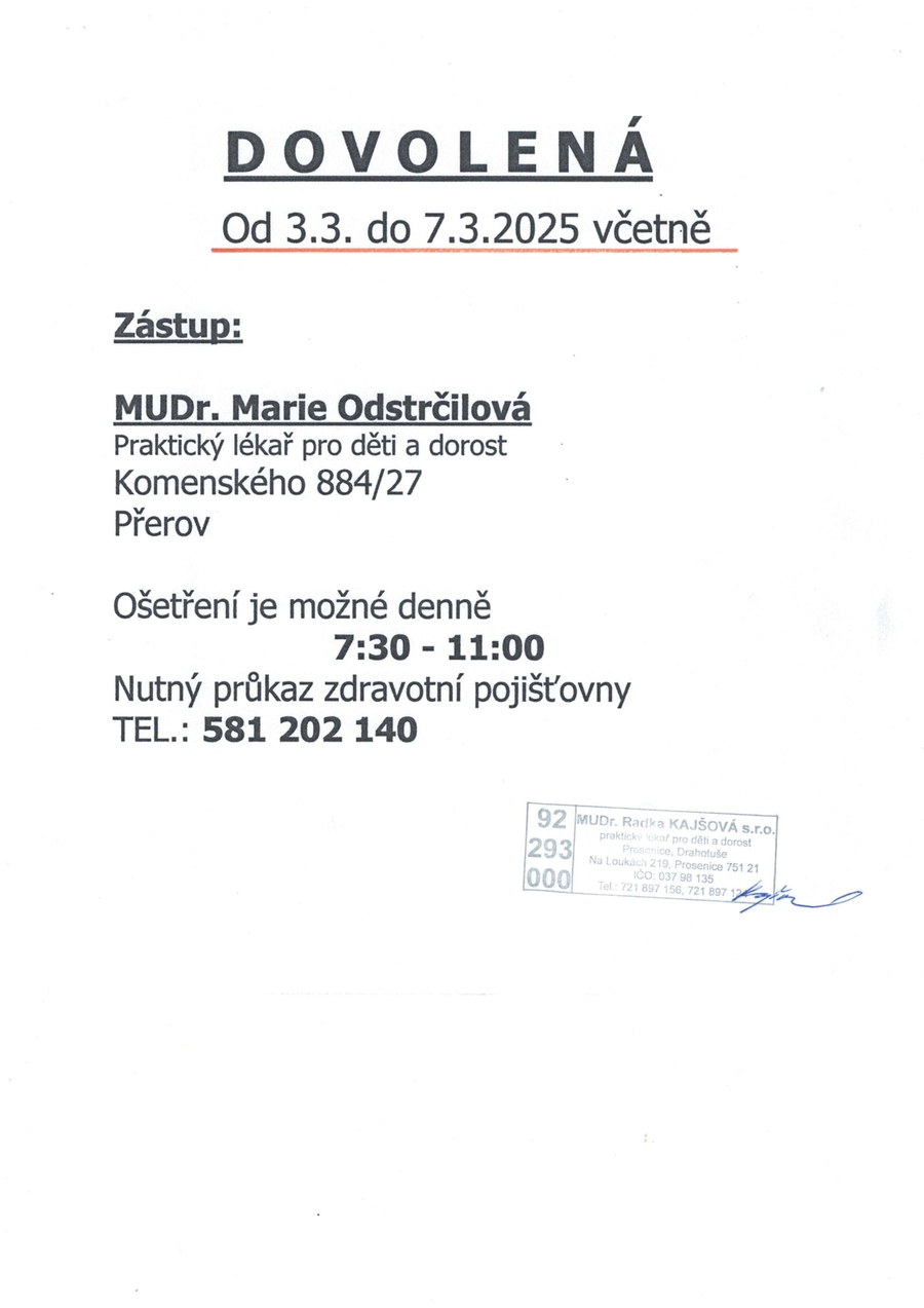 dovolená MUDr. Kajšová_page-0001.jpgMUDr. Kajšová oznamuje čerpání dovolené ve dnech 3. 3. - 7. 3. 2025.