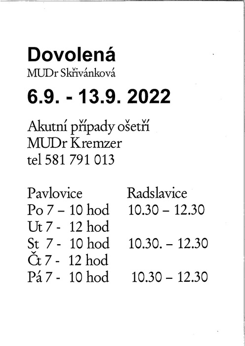 Zdravotní středisko Prosenice MUDr. Skřivánková sděluje, že od 6.9 do 13.9 čerpá dovolenou. Akutní případy ošetří MUDr. Kremzer tel: 581 791 013 a to: