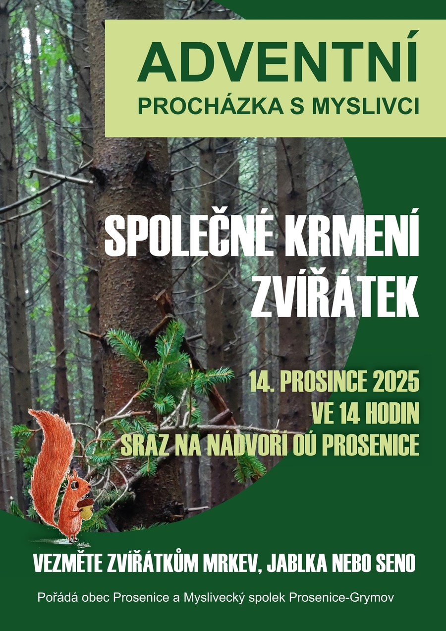 Třetí adventní neděli 14. prosince vyrazíme s myslivci naprocházku do přírody, kde připravíme hostinu pro zvířátka. Sraz bude ve 14 hodin na nádvoří obecního úřadu. Kdo neujde delší trasu, může jít rovnou k Rýnskému rybníku, kam dorazíme okolo 14.30 hodin. Mrkve, jablka nebo seno vezměte zvířátkům s sebou.