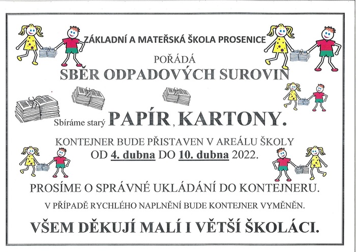 Základní a Mateřská škola Prosenice pořádá sběr odpadových surovin. Sbíráme starý papír, kartony. Kontejner bude přistaven v areálu školy od 4. dubna do 10. dubna 2022. Prosíme o správné ukládání do kontejneru. V případě rychlého naplnění bude kontejner vyměněn. Všem děkují malí i větší školáci.