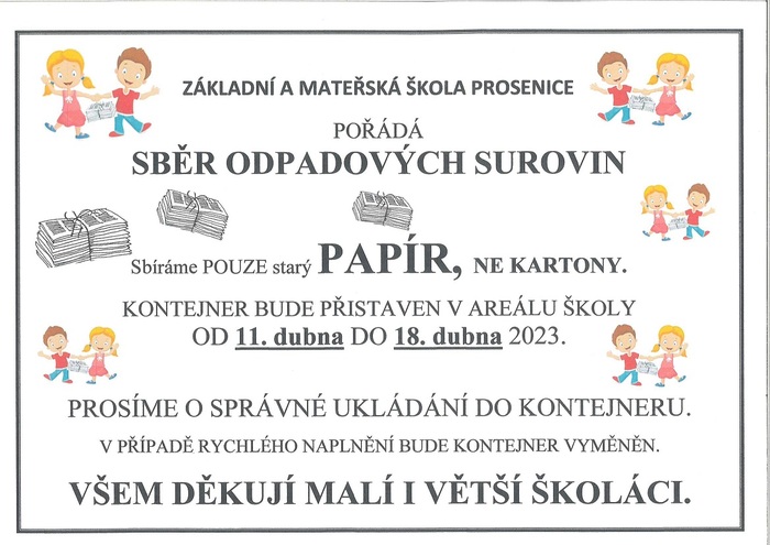 Základní a Mateřská škola Prosenice pořádá sběr odpadových surovin. Sbírá se pouze starý papír, ne kartony. Kontejner bude přistaven v areálu školy od 11. dubna do 18. dubna 2023. Prosíme o správné ukládání do kontejneru. V případě rychlého naplnění bude kontejner vyměněn. Všem děkují malí i větší školáci.