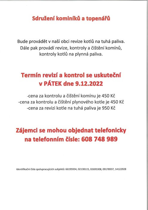 Sdružení kominíků a topenářů bude provádět v naší obci revize kotlů na tuhá paliva. Dále pak provádí revize, kontroly a čištění komínů, kontroly kotlů na plynná paliva. Termín revizí a kontrol se uskuteční v pátek dne 9.12. 2022.