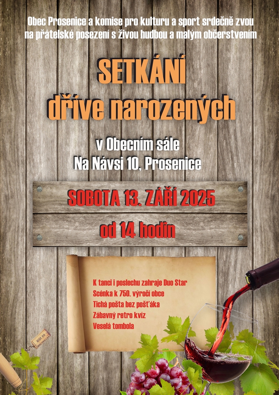 Srdečně zveme dříve narozené spoluobčany na společné setkání do Obecního sálu v Prosenicích v sobotu 13. září 2025 od 14 hodin. Připraven je pestrý program s živou hudbou. Chybět nebude oblíbená veselá tombola, malé občerstvení a retro kvíz připravený na přání. Nezapomeňte si vzít brýle na čtení!