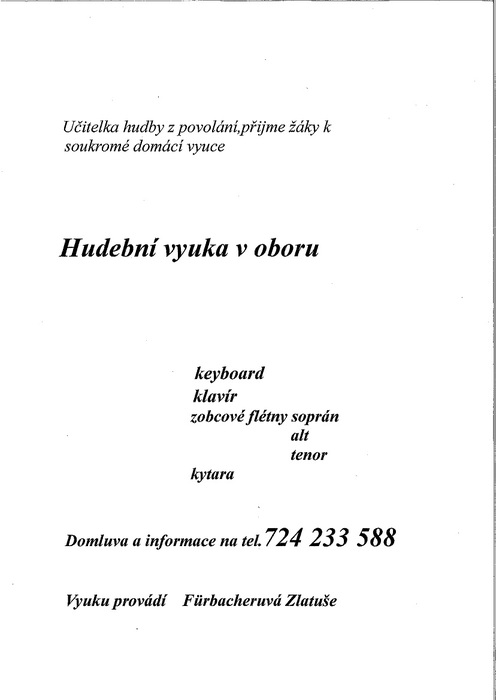 Učitelka hudby z povolání, přijme žáky k soukromé domácí výuce. Domluva a informace na tel. 724 233 588