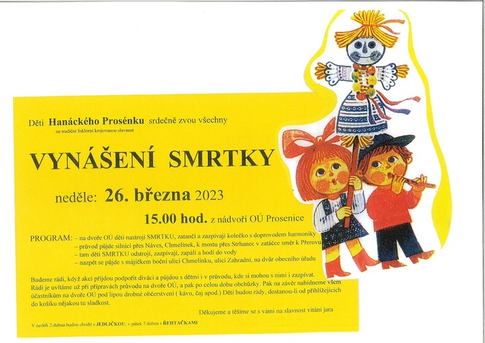 Děti Hanáckého Prosénku srdečně zvou všechny na tradiční folklorní krojovanou slavnost "Vynášení smrtky" a to v neděli 26. března 2023 v 15.00 hodin z nádvoří OÚ Prosenice. Na dvoře OÚ děti nastrojí SMRTKU, zatančí a zazpívají kolečko s doprovodem harmoniky- průvod půjde silnicí přes Náves, Chmelínek, k mostu přes Strhanec v zatáčce směr k Přerovu- tam děti SMRTKU odstrojí, zazpívají, zapálí a hodí do vody. Nazpět se půjde s májíčkem boční ulicí Chmelínku, ulicí Zahradní, na dvůr obecního úřadu. Budeme rádi, když akci přijdou podpořit diváci a půjdou s dětmi i v průvodu, kde si mohou s nimi i zazpívat. Rádi je uvítáme už při přípravách průvodu na dvoře OÚ, a pak po celou dobu obchůzky. Pak na závěr nabídneme všem účastníkům na dvoře OÚ pod lipou drobné občerstvení (kávu, čaj apod.) Děti budou rády, dostanou-li od přihlížejících do košíku nějakou tu sladkost. Děkujeme a těšíme se s vámi na slavnost vítání jara.
